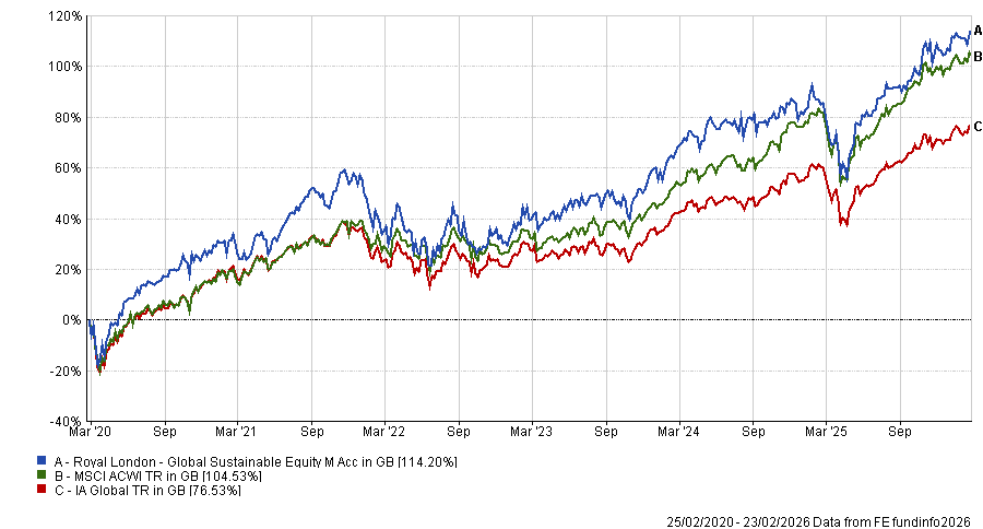 Royal London Global Sustainable Equity delivered a top-quartile return in the IA Global sector in 2025, gaining 14.5% versus the IA Global sector average of 11.2%. It has beaten both the sector and its benchmark since it was launched in February 2020, gaining 114.2% over that time.